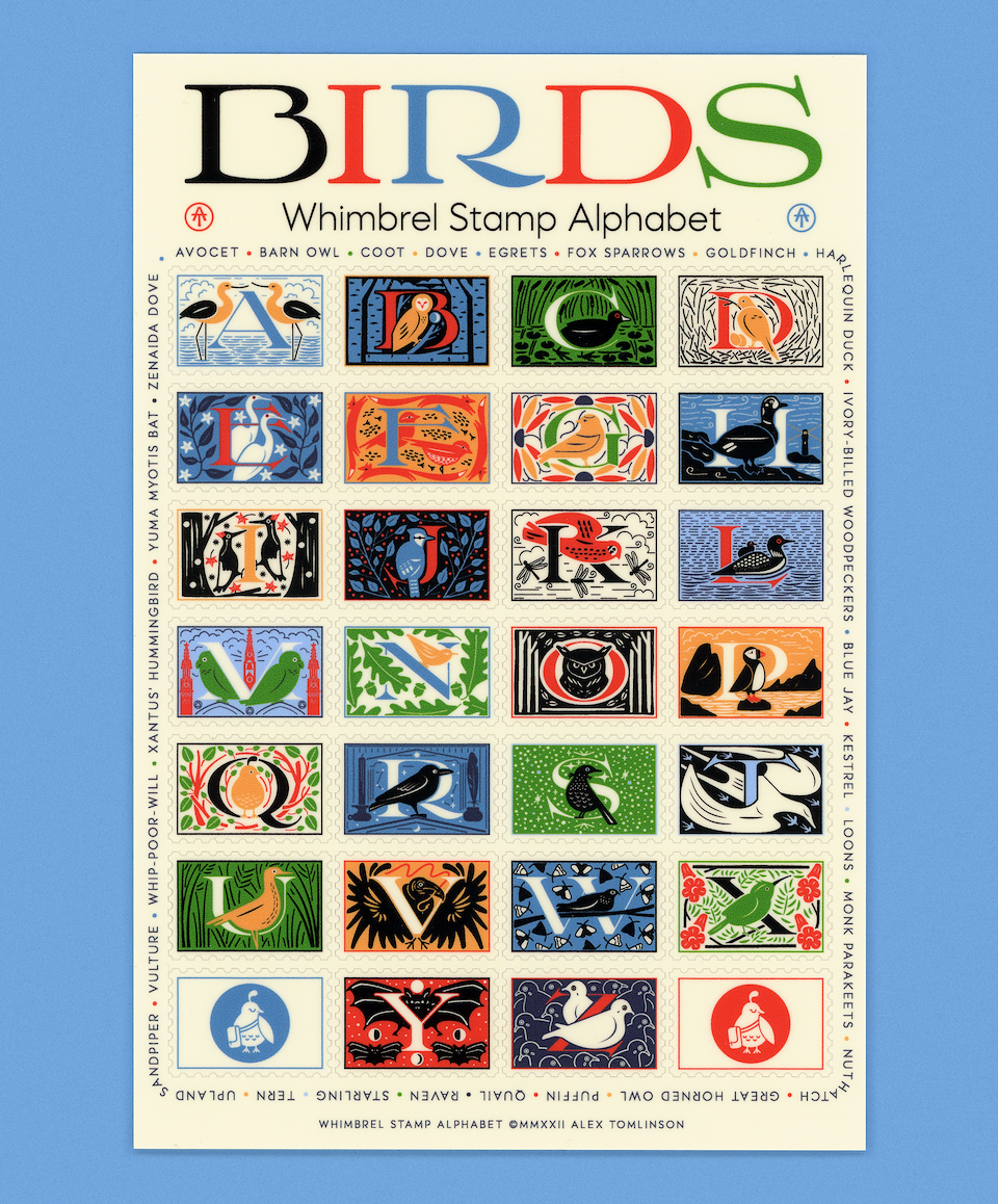 This design comes from my “Whimbrel” font project. Inspired by the nameplate of an old 1940s “Bird Lore” magazine- it quickly grew to include these colorful drop caps. Now for the first time ever this birdy alphabet is available for download by snail mail with a souvenir limited edition stamp sheet!
