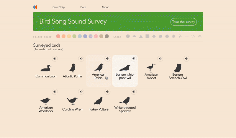 An attempt to determine by online survey if there are any agreed-upon colors or shapes for bird vocalizations. Colorchirp.com was spurred by the unexpected and immense response to my original “Backyard Sounds” graphic.