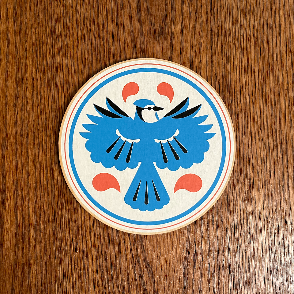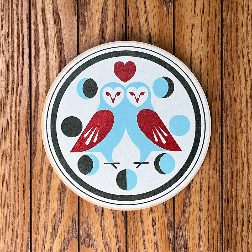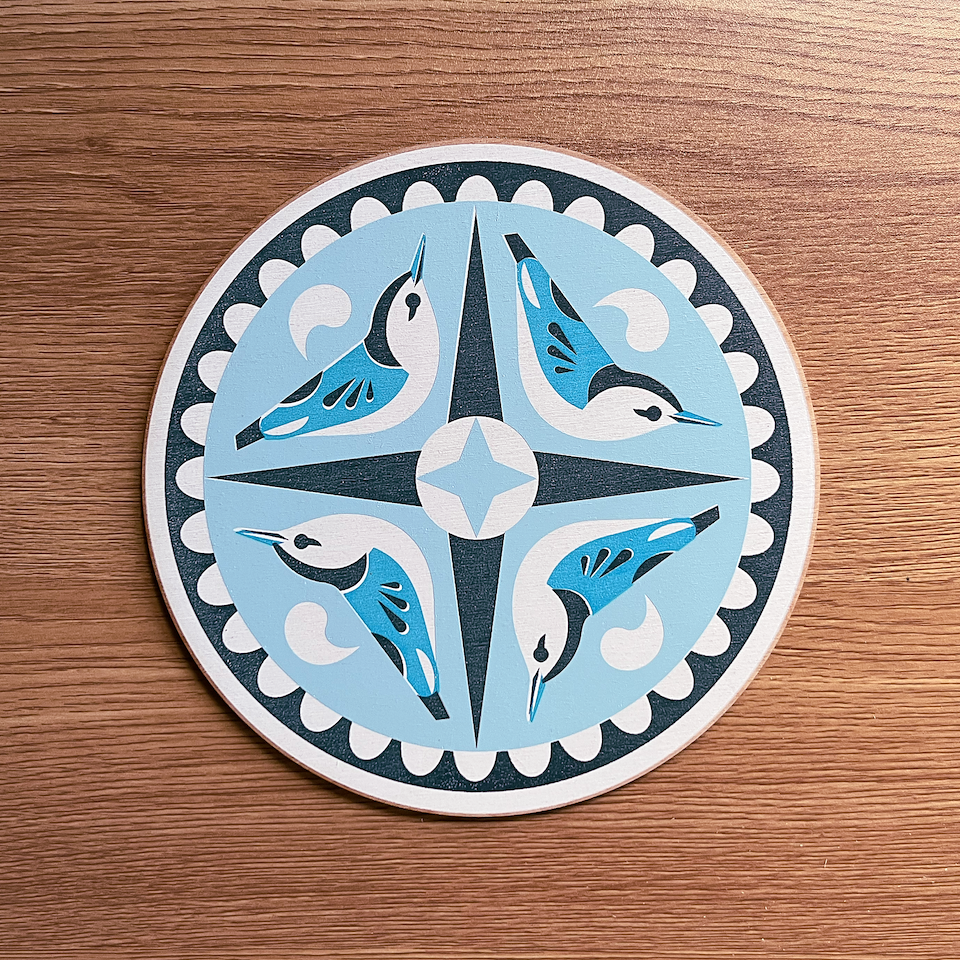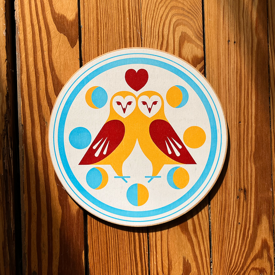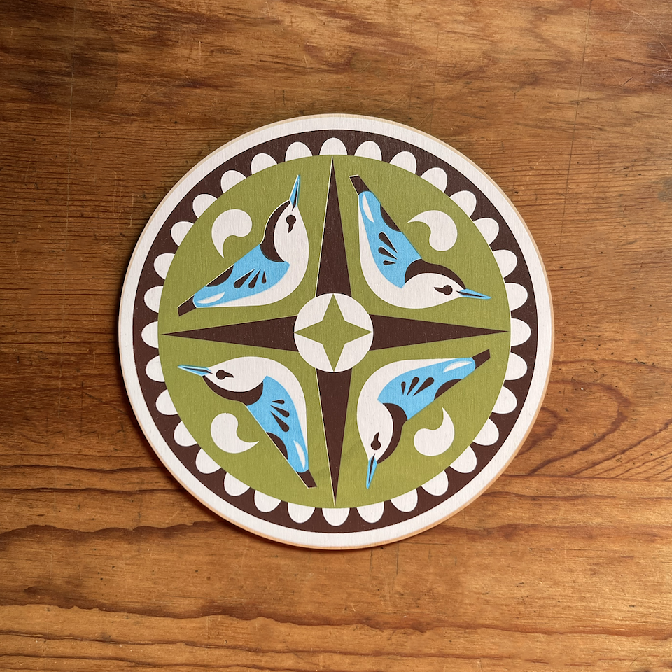 Screen prints on wood inspired by historic Pennsylvania Dutch hex signs, but much birdier of course!